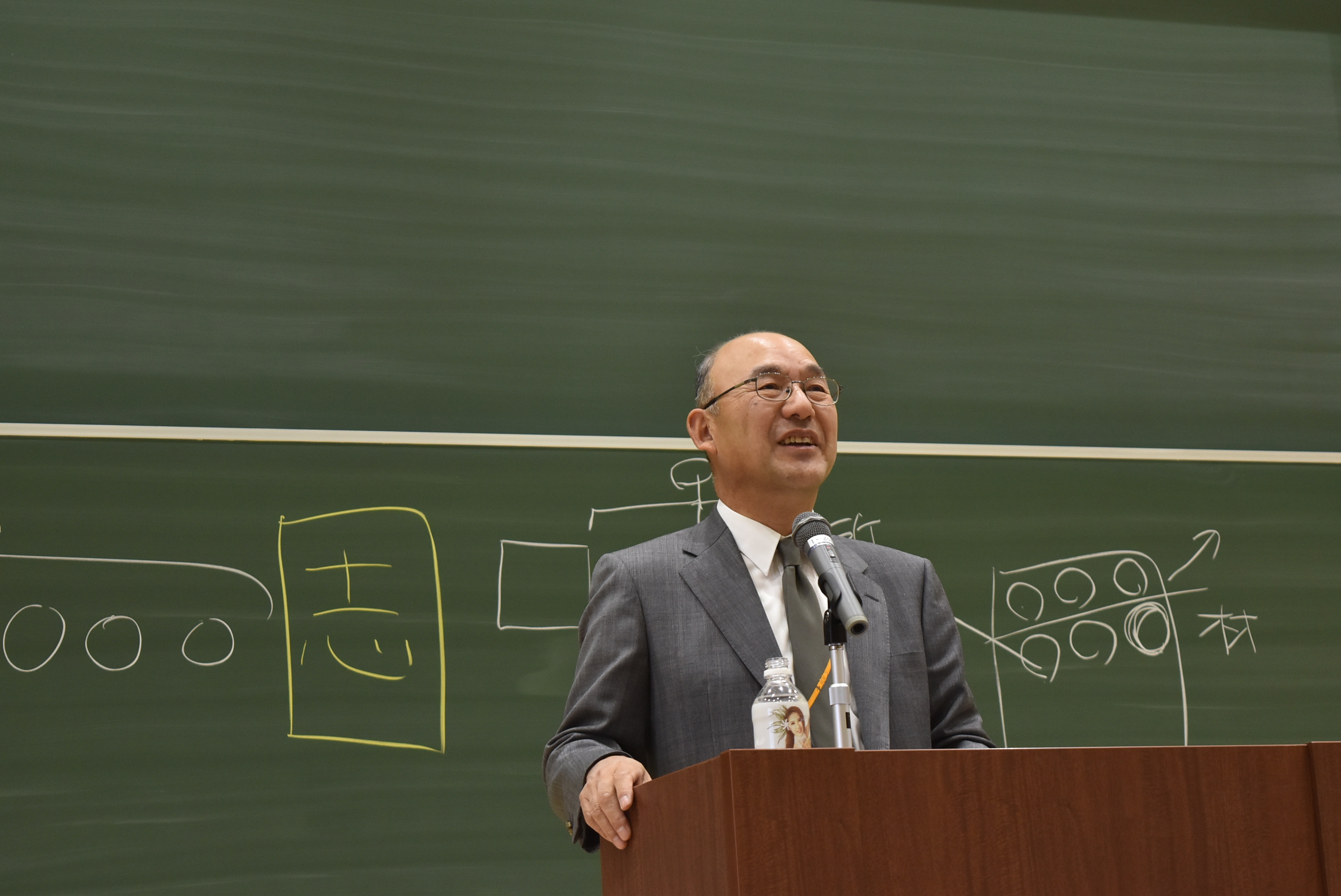 井上社長は「観光まちづくりとハワイアンズの取り組み」をテーマに講義しました。まず「観光業の現状は、サスティナブルツーリズム(持続可能な観光)のように、観光地域に負担をかけずに、メリットをもたらす観光のためにまちづくりをしていく流れになっている」と解説。東日本大震災後に今日まで生き残った原因について「環境が変化しても変化してはならない本質を維持しながら、変化すべきところは大胆に変化させてきた」と振り返り、「未だ復旧のできていない企業があるが、手を携えてこの地域を盛り上げていきたい」と決意を語りました。最後に「志をもつこと、信頼できる相談相手をもつこと、自分の考えをもつことが大事です。無駄な勉強は決してありません」とエールを送りました。