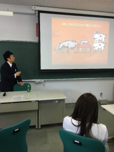 授業担当の鈴木からは、まず、減災教育の意義について学生に問いかけがあり、無くなることのない災害のリスクをどのように最小限にとどめ、子どもたちが自ら命を守るための行動を促すことができるのかについて講義がありました。また、避難訓練についても、強制ではなく発達を総合的に捉えて意欲を引き出す指導の工夫について提案がありました。その方法の一つにあげられる減災絵本を活用して、こどもたちに総合的にアプローチする方法について、実践例を取り上げて講義を行いました。