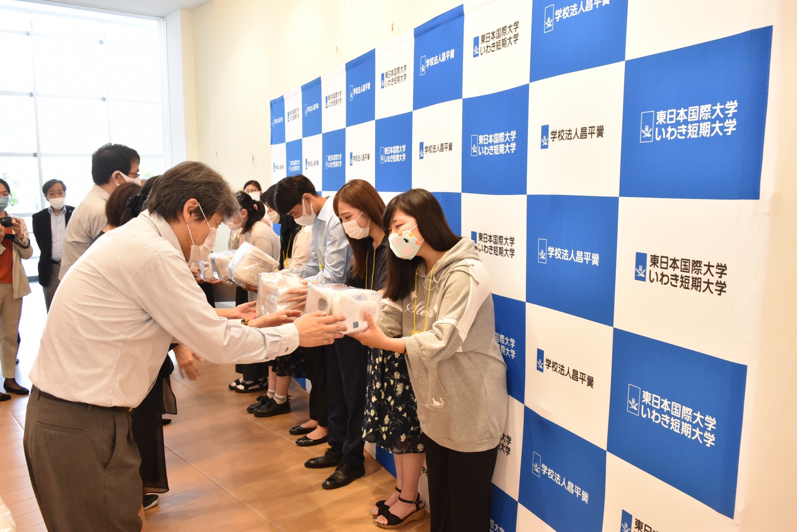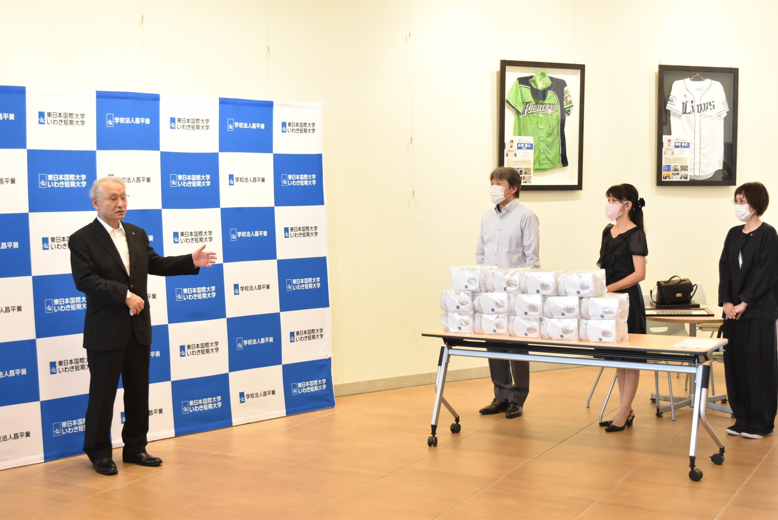 学校法人昌平黌の同窓会「黌友会」は8月27日、東日本国際大学・いわき短期大学の学生にマスクを寄贈しました。本学1号館で寄贈式が行われ、学生の代表に手渡されました。