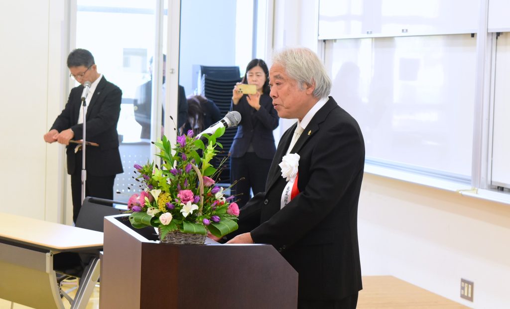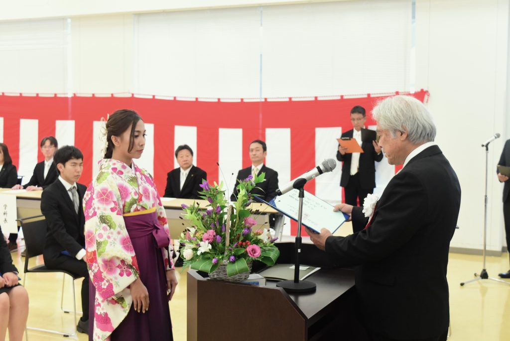 はじめに、中山哲志学長が卒業生全員に学位記を授与し、「建学の精神に基づく人間力をこれからも社会生活に役立ててください。社会に出てからも良い出会いを大切にし、地域のために人々のために活躍されることを期待しております。」と式辞を述べました。