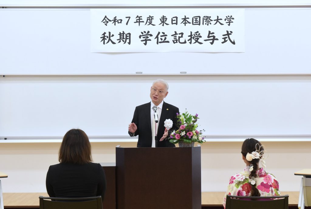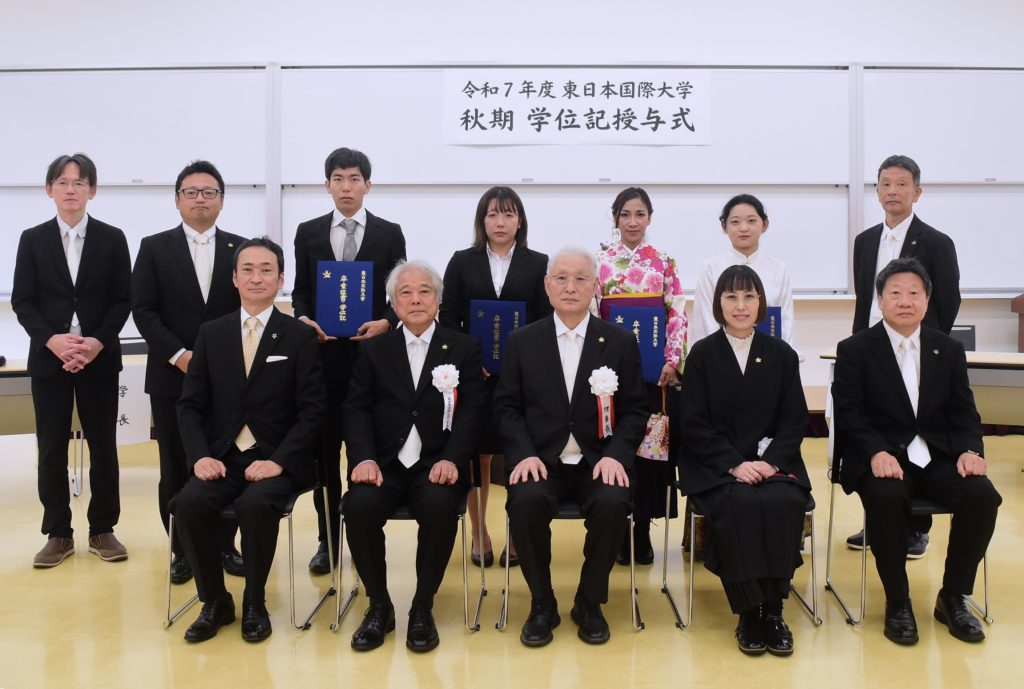 東日本国際大学の令和7年度秋期学位記授与式が9月25日、本学1号館で行われ、経済経営学部および健康福祉学部の5名が晴れの門出を迎えました。
