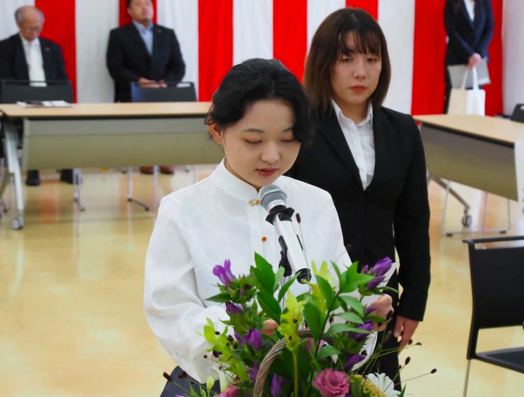 最後にチョウ シンコウさん(中国出身)が卒業にあたって家族、教職員への感謝の言葉を述べながら、「多くの仲間の支えによって一歩一歩困難を乗り越えることができました。その過程で学んだのは、知識だけではなく、多様の価値観を理解し、尊重する姿勢、そして挑戦することです。大学で培った経験は成果として必ず大きな力になると確信しています。」と卒業生を代表して挨拶しました。
