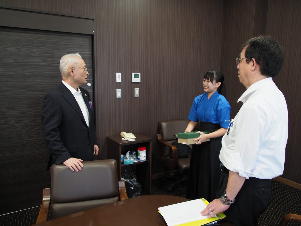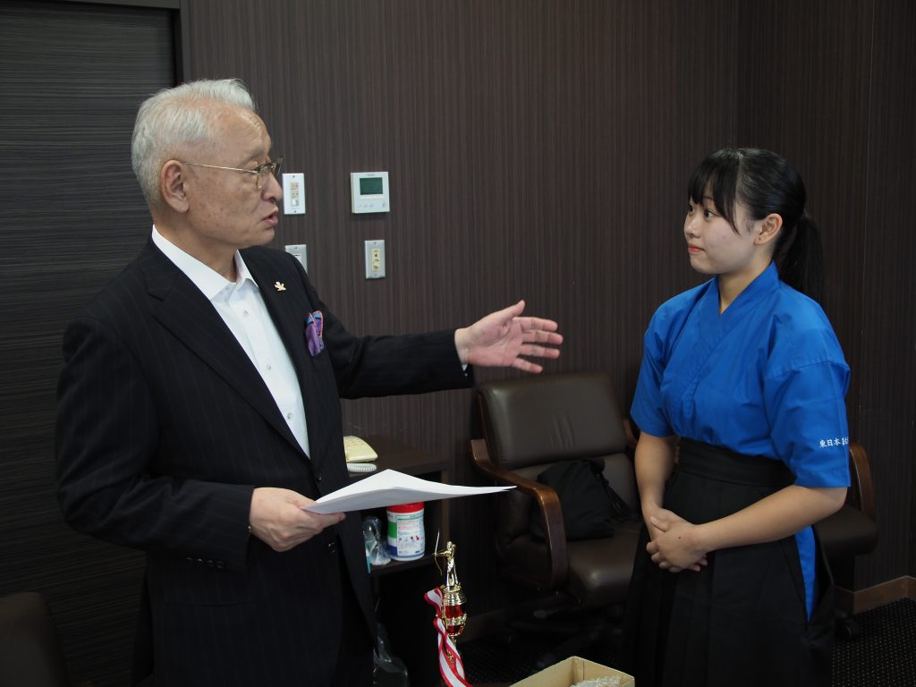 報告を受け緑川理事長からは、「全国の強豪が集まる大会での6位入賞は、日々のたゆまぬ努力の賜物であり、大変誇らしく思います。この結果に満足することなく、弓道を通して人間的にも大きく成長されることを期待しています。来年も最後の年として、さらなる高みを目指して頑張ってください」と、快挙を称えるとともに温かい激励の言葉を贈りました。