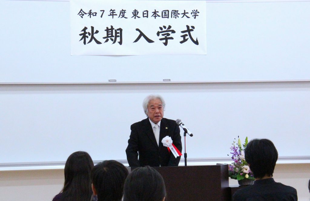 東日本国際大学の令和7年度秋期入学式が10月2日、本学1号館で行われ、経済経営学部に10名、健康福祉学部3名(うち再入学1名)の留学生が入学しました。また、開南大学との交換留学生1名が在学許可されました。新入生全員を呼名した後、中山哲志学長が入学許可を宣言しました。