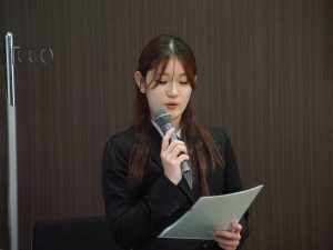 はじめに、研修の引率を担当した経済経営学部の李和貞(イ・ファジョン)教授から「学生たちが文化や歴史、最先端技術に触れるだけでなく、互いに助け合いながら成長していく姿に大きな感動を覚えました」と述べました。釜山やソウルでの学びはもちろん、慶南大学での交流やサムスンでの見学を通じて、それぞれが自分の可能性を見つめ直す貴重な体験になったと振り返りました。