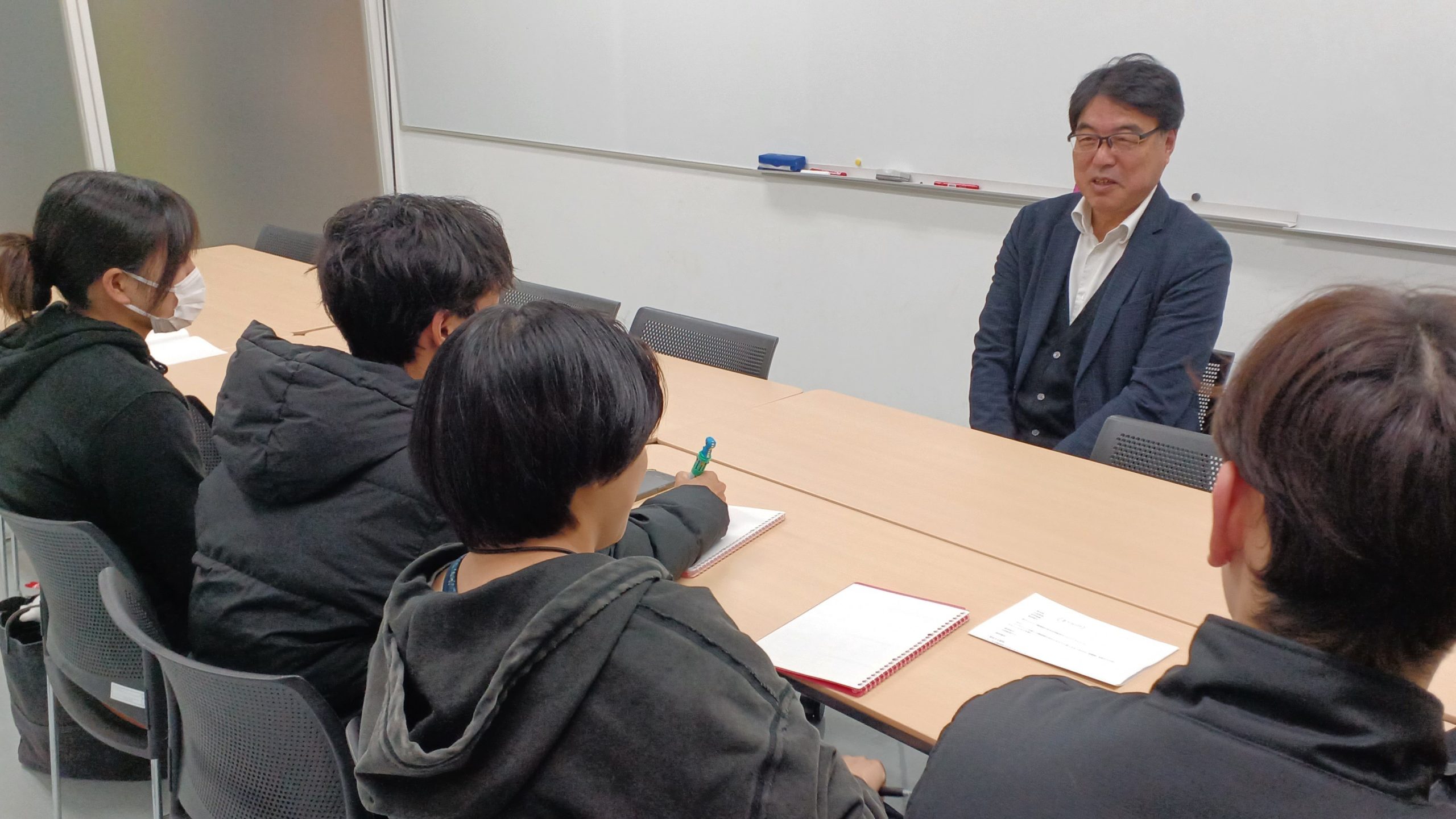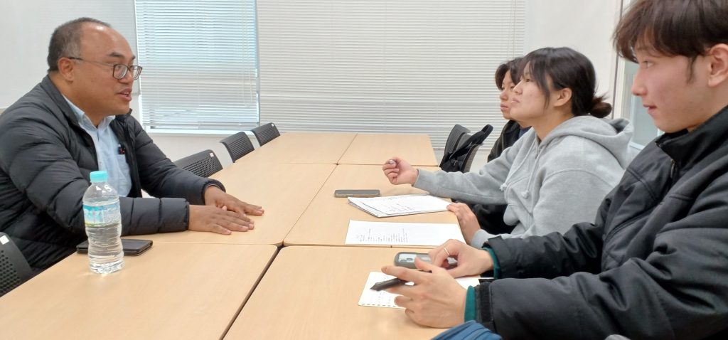 学生たちが訪ねたのは、山田紀浩教授とシュレスタ・サハデブ特任講師。山田先生は韓国の大学院で博士号を取り、韓国語やアジア事情、市民社会論の授業を担当、サハデブ先生はネパール出身で、グローバルビジネスや経営戦略を教えており、いずれも国際性豊かな人選となりました。