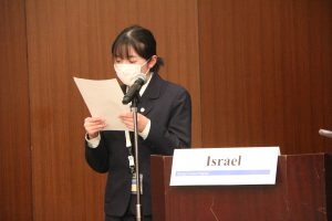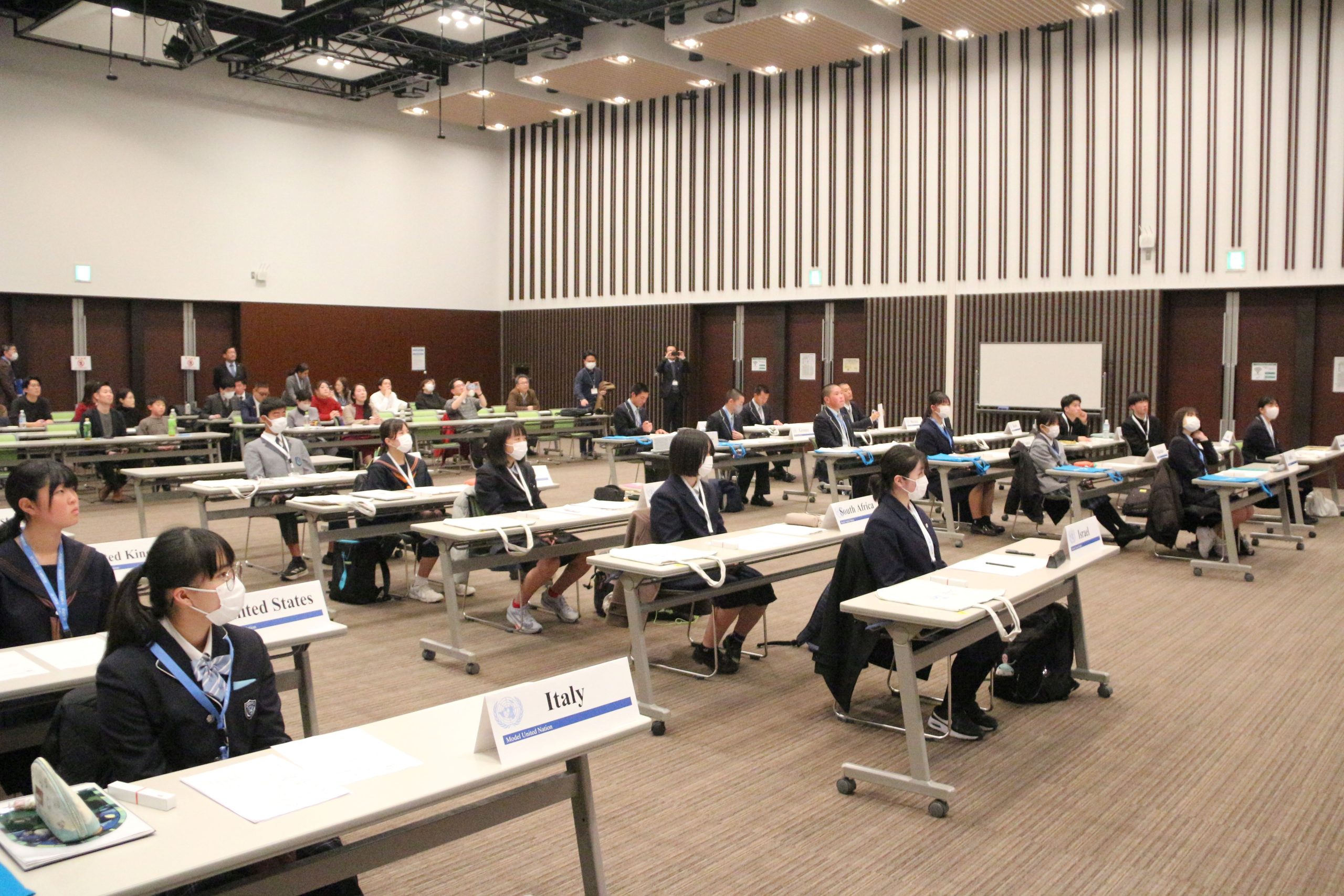 模擬国連は参加者が各国の大使になりきり、提起された課題の解決に向けて議論する教育プログラムです。今回は市内の中学・高校生22人が参加。国連本部内の「国連カフェ」で提供されるメニューをテーマに活発に議論を重ねました。