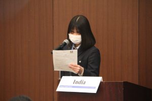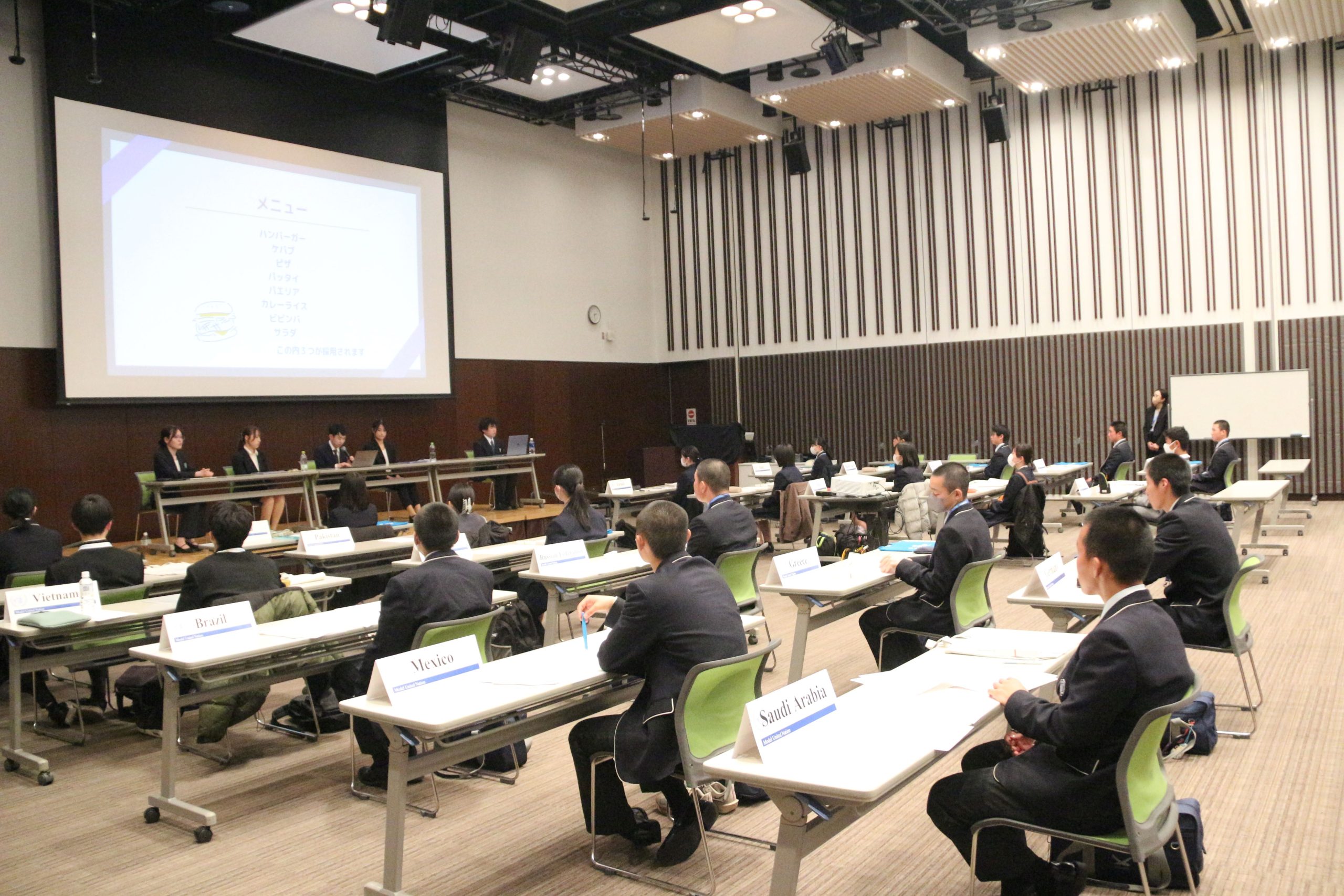 参加者たちは、それぞれの国の食文化や宗教的背景を踏まえながらメニュー案を検討し、その理由を1分程度で発表しました。例えば、日本の大使は米や魚を使った料理を提案し、インドの大使はヒンドゥー教やイスラム教の信仰を持つ人が多いことを考慮し、牛肉や豚肉を避けた鶏肉のカレーを提案しました。また、トルコの大使は、イスラム教徒が世界に多いことを踏まえ、ケバブを提案するなど、それぞれが真剣に考えた案を発表しました。