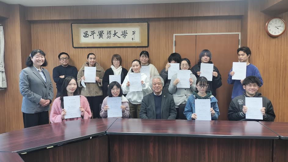 昨年11月6日から約3か月に渡り、講義や実習を受けた受講者12名(本学学生7名、一般5名)へ中山哲志学長より修了証明書が授与されました。