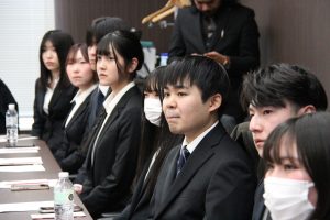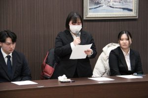 結団式では、学生代表である経済経営学部4年の中野莉珠さん及びインターン研修を行う経済経営学部4年の鎌田璃珠さんから、今回の研修は単なる語学研修以上の意味を持つものであり、異文化理解に努めるとともに、ハンフォード地域の経済発展の状況を学修したい、自分が福島浜通り地域と米国ハンフォード地域の人的な交流の一員になることができて大変嬉しいとの挨拶がありました。