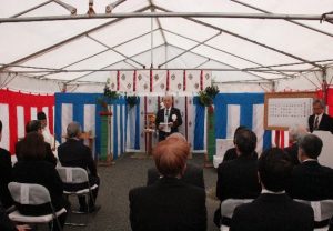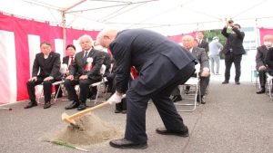 式では地鎮の儀として、緑川理事長、設計者、施工業者の関係者による刈初めの儀、鍬入れの儀、鋤入れの儀が行われ、工事の安全と建物の完成を祈念しました。